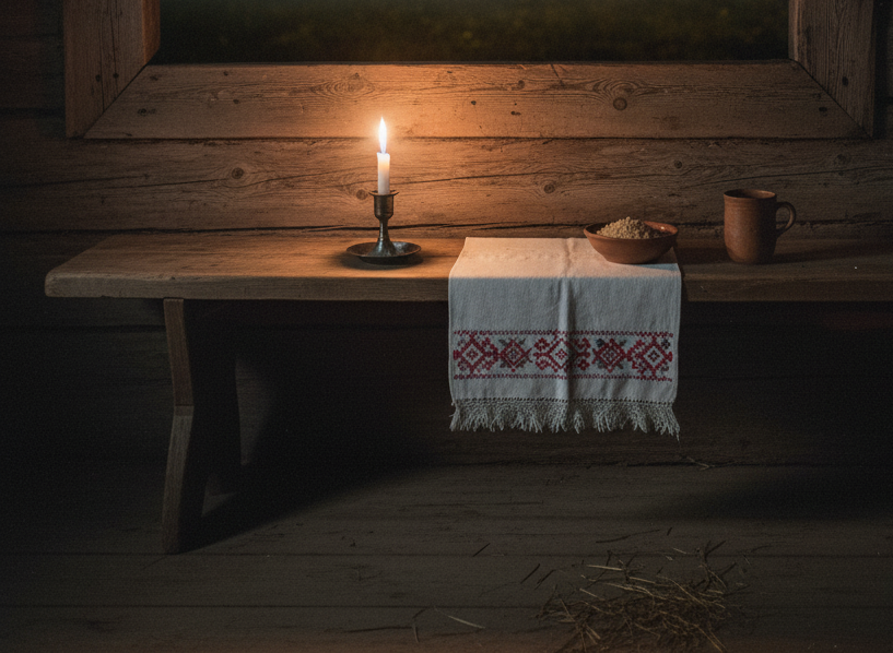 • Nakaz: Najważniejszym rytuałem było wspólne jedzenie (uczta) połączone z symbolicznym karmieniem zmarłych. Na stole zostawiano resztki wieczerzy lub specjalne potrawy postne w nieparzystej liczbie, np. kaszę, kutię, bliny, miód (sytę) [1],[7]. Pierwszy naleśnik lub część gorącej kaszy układano na oknach, aby parą pożywiły się dusze.